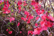 ボケの花がさくらにまけないくらい満開です。